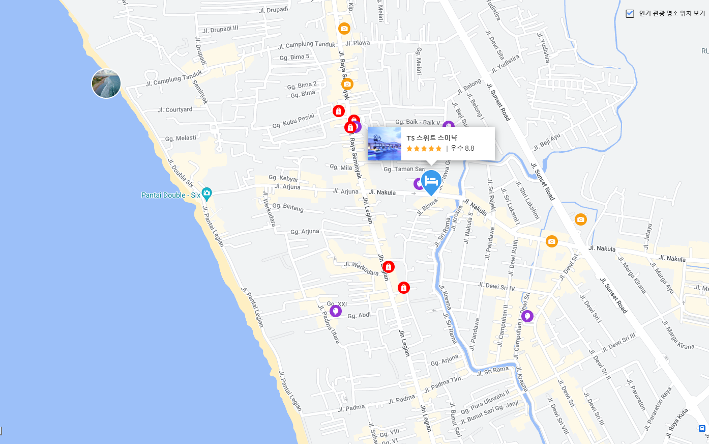 TS 스위트 스미냑은 해변과 가까운 위치에 있어, 발리의 아름다운 해변을 쉽게 즐길 수 있는 이점이 있습니다. 스미냑 비치는 화려한 일몰과 함께 여유로운 해변 활동을 즐길 수 있는 완벽한 장소로, 서핑, 일광욕, 해양 스포츠 등을 통해 다양한 액티비티를 경험할 수 있습니다.