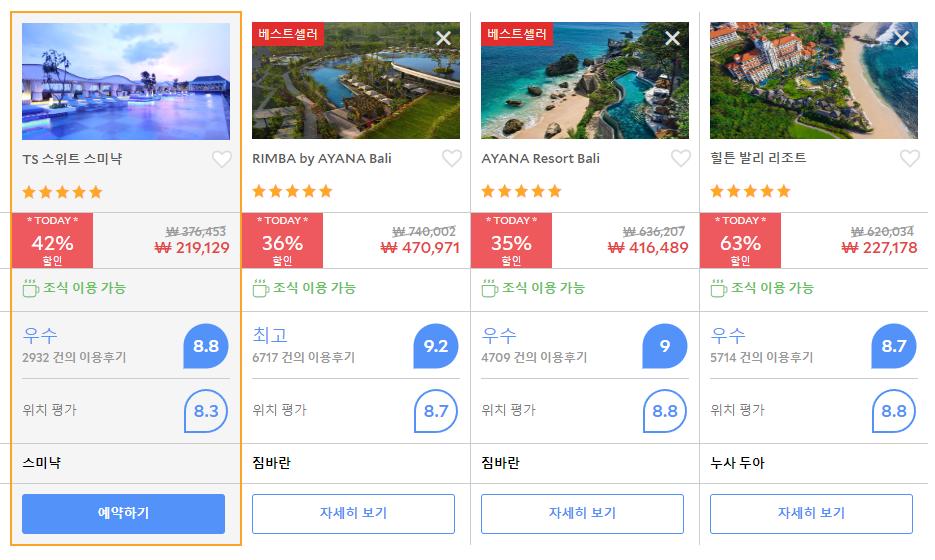 발리호텔 TS 스위트 스미냑 (TS Suites Seminyak)의 최저 가격대는 아고다웹사이트에서 할인특가 가격으로 매일매일 변동되며 10만원대부터 다양하게 형성됩니다. 날짜별로 매일 가격이 다르므로 아고다웹사이트 최저가를 확인하시려면 아래 링크를 누르시고 원하는 날짜의 가격대를 선택해야 정확한 가격을 자세히 보실 수 있습니다.