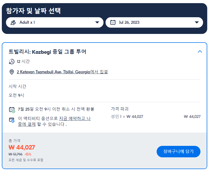 트빌리시출발 카즈베기 종일 그룹 현지투어 (Tbilisi Kazbegi Full-Day Group Tour)는 GET YOUR GUIDE 사이트에서 예약하실 수 있습니다. 사이트는 특히 전세계 대부분의 나라, 지역의 투어, 교통편 있어, 쉽게 찾을 수 없는 여행지의 다양한 투어 및 서비스를 이용할 수 있는 글로벌 사이트입니다. 전세계 여행자들이 많이 사용하는 사이트로 한국분들이 많이 예약하는 투어를 찾으신다면 klook 여행사이트 추천합니다. 함께 사용하시면 더욱 편하게 여행하실 수 있습니다.