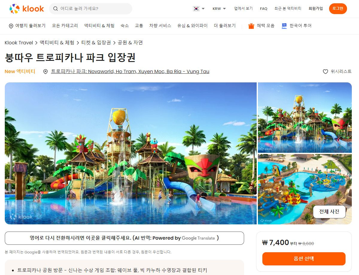 붕따우 트로피카나 파크 입장권 클룩사이트에서 쉽게 예약하실 수 있으며, 이메일, 전화번호, 카카오톡, 네이버, 구글, 애플, 페이스복 등으로 간편하게 회원가입하고 이용하실 수 있습니다. 가격은 변동될 수 있으므로 예약시 다시 확인하고 이용하세요~