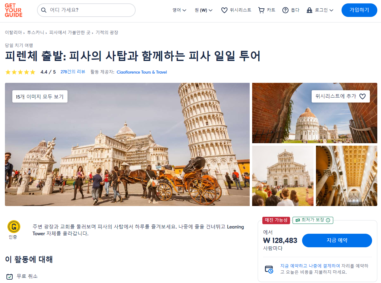 피렌체 출발 피사의 사탑과 함께하는 피사 일일 투어 (Pisa Day Tour with Leaning Tower of Pisa From Florence)는 GET YOUR GUIDE 사이트에서 예약하실 수 있습니다. 사이트는 특히 전세계 대부분의 나라, 지역의 투어, 교통편 있어, 쉽게 찾을 수 없는 여행지의 다양한 투어 및 서비스를 이용할 수 있는 글로벌 사이트입니다. 전세계 여행자들이 많이 사용하는 사이트로 한국분들이 많이 예약하는 투어를 찾으신다면 klook 여행사이트 추천합니다. 함께 사용하시면 더욱 편하게 여행하실 수 있습니다.