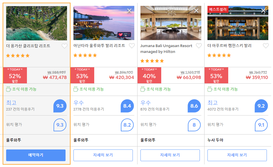 발리호텔 더 웅가산 클리프탑 리조트 (The Ungasan Clifftop Resort)의 최저 가격대는 아고다웹사이트에서 할인특가 가격으로 매일매일 변동되며 10만원대부터 다양하게 형성됩니다. 날짜별로 매일 가격이 다르므로 아고다웹사이트 최저가를 확인하시려면 아래 링크를 누르시고 원하는 날짜의 가격대를 선택해야 정확한 가격을 자세히 보실 수 있습니다.