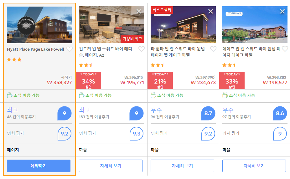하얏트 플레이스 페이지 레이크 파월(Hyatt Place Page Lake Powell)의 최저 가격대는 아고다웹사이트에서 할인특가 가격으로 매일매일 변동되며 10만원대부터 다양하게 형성됩니다. 날짜별로 매일 가격이 다르므로 아고다웹사이트 최저가를 확인하시려면 아래 링크를 누르시고 원하는 날짜의 가격대를 선택해야 정확한 가격을 자세히 보실 수 있습니다.