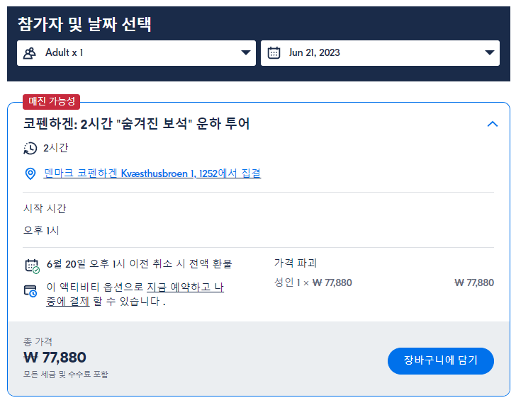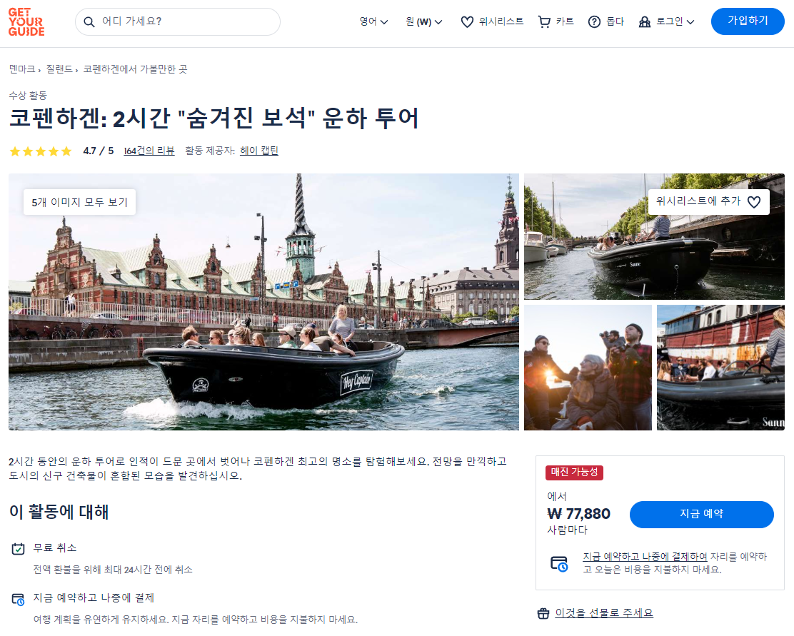 코펜하겐 2시간 "숨겨진 보석" 운하 투어 (Copenhagen 2-hour “Hidden Gems” Canal Tour)는 GET YOUR GUIDE 사이트에서 예약하실 수 있습니다. 사이트는 특히 전세계 대부분의 나라, 지역의 투어, 교통편 있어, 쉽게 찾을 수 없는 여행지의 다양한 투어 및 서비스를 이용할 수 있는 글로벌 사이트입니다. 전세계 여행자들이 많이 사용하는 사이트로 한국분들이 많이 예약하는 투어를 찾으신다면 klook 여행사이트 추천합니다. 함께 사용하시면 더욱 편하게 여행하실 수 있습니다.