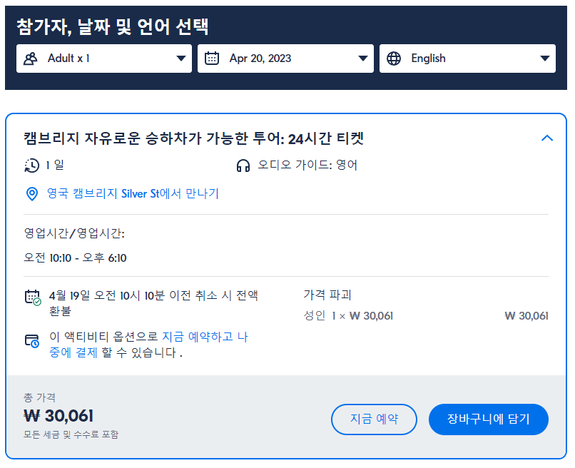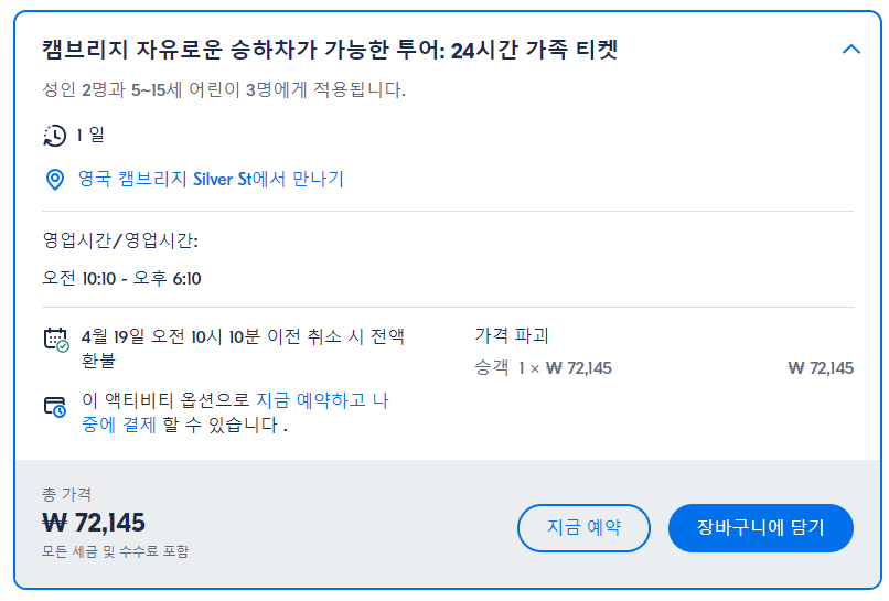 케임브리지 24시간 자유로운 승하차가 가능한 버스 투어는 GET YOUR GUIDE 사이트에서 예약하실 수 있습니다. 사이트는 특히 전세계 대부분의 나라, 지역의 투어, 교통편 있어, 쉽게 찾을 수 없는 여행지의 다양한 투어 및 서비스를 이용할 수 있는 글로벌 사이트입니다. 전세계 여행자들이 많이 사용하는 사이트로 한국분들이 많이 예약하는 투어를 찾으신다면 klook 여행사이트 추천합니다. 함께 사용하시면 더욱 편하게 여행하실 수 있습니다.