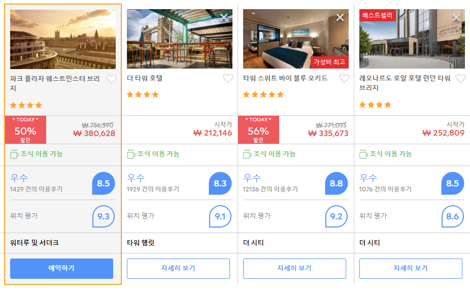 런던호텔 파크 플라자 웨스트민스터 브리지 (Park Plaza Westminster Bridge Hotel)의 최저 가격대는 아고다웹사이트에서 할인특가 가격으로 매일매일 변동되며 10만원대부터 다양하게 형성됩니다. 날짜별로 매일 가격이 다르므로 아고다웹사이트 최저가를 확인하시려면 아래 링크를 누르시고 원하는 날짜의 가격대를 선택해야 정확한 가격을 자세히 보실 수 있습니다.