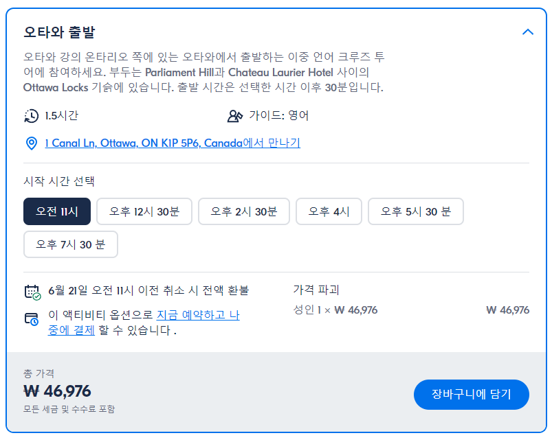 오타와 관광 리버 크루즈(Ottawa Sightseeing River Cruise)는 GET YOUR GUIDE 사이트에서 예약하실 수 있습니다. 사이트는 특히 전세계 대부분의 나라, 지역의 투어, 교통편 있어, 쉽게 찾을 수 없는 여행지의 다양한 투어 및 서비스를 이용할 수 있는 글로벌 사이트입니다. 전세계 여행자들이 많이 사용하는 사이트로 한국분들이 많이 예약하는 투어를 찾으신다면 klook 여행사이트 추천합니다. 함께 사용하시면 더욱 편하게 여행하실 수 있습니다.