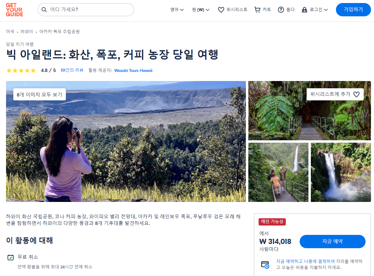 빅 아일랜드 화산, 폭포, 커피 농장 당일 여행(Big Island Volcanoes, Waterfalls, & Coffee Farm Day-Trip)은 GET YOUR GUIDE 사이트에서 예약하실 수 있습니다. 사이트는 특히 전세계 대부분의 나라, 지역의 투어, 교통편 있어, 쉽게 찾을 수 없는 여행지의 다양한 투어 및 서비스를 이용할 수 있는 글로벌 사이트입니다. 전세계 여행자들이 많이 사용하는 사이트로 한국분들이 많이 예약하는 투어를 찾으신다면 klook 여행사이트 추천합니다. 함께 사용하시면 더욱 편하게 여행하실 수 있습니다.