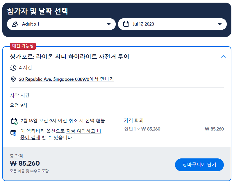 싱가포르 라이온 시티 하이라이트 자전거 투어 (Singapore Lion City Highlights Bike Tour)는 GET YOUR GUIDE 사이트에서 예약하실 수 있습니다. 사이트는 특히 전세계 대부분의 나라, 지역의 투어, 교통편 있어, 쉽게 찾을 수 없는 여행지의 다양한 투어 및 서비스를 이용할 수 있는 글로벌 사이트입니다. 전세계 여행자들이 많이 사용하는 사이트로 한국분들이 많이 예약하는 투어를 찾으신다면 klook 여행사이트 추천합니다. 함께 사용하시면 더욱 편하게 여행하실 수 있습니다.