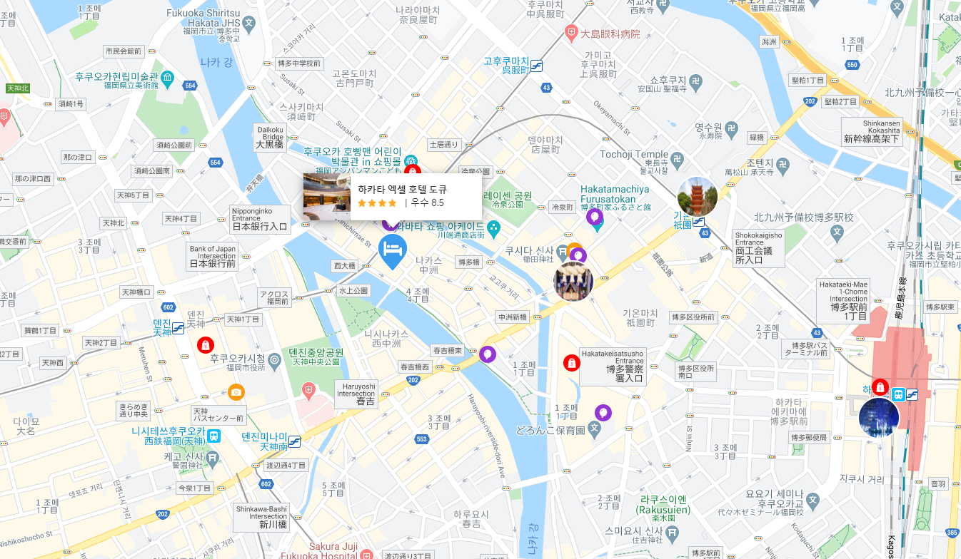 후쿠오카 나카스가와바타역에서 도보 3분정도거리의 텐진터미널도 10분거리에 있는 위치좋고 가성비 좋은 하카타 엑셀 호텔 도큐(Hakata Excel Hotel Tokyu)은 주변에 나카스 강변, 돈키호텔, 이치란라멘 등이 있어 편리합니다. 단점은 룸크기가 작은 점 ㅎㅎ