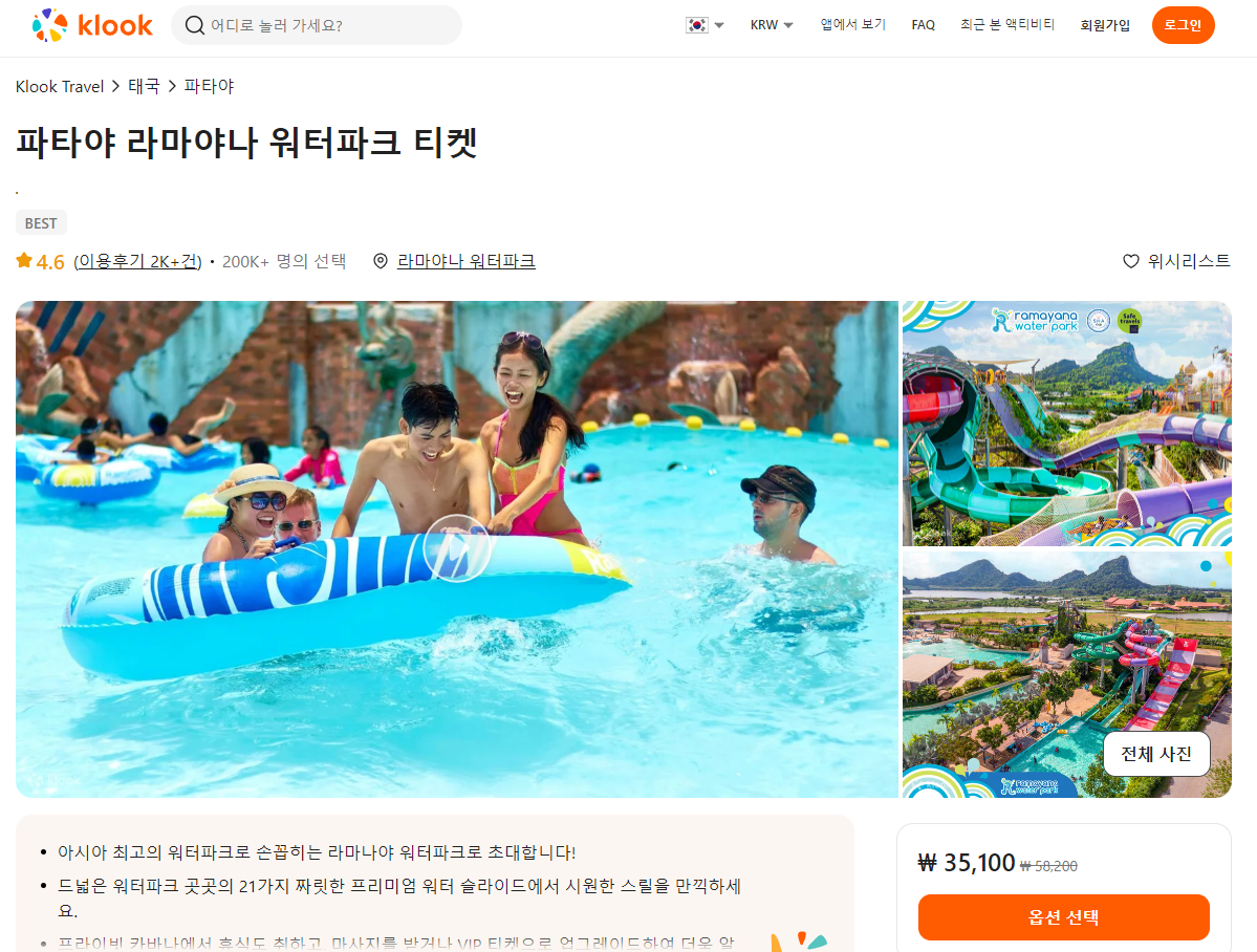 태국최대 파타야 라마야나 워터파크 입장권은 클룩사이트에서 쉽게 예약하실 수 있으며, 이메일, 전화번호, 카카오톡, 네이버, 구글, 애플, 페이스복 등으로 간편하게 회원가입하고 이용하실 수 있습니다. 가격은 변동될 수 있으므로 예약시 다시 확인하고 이용하세요~