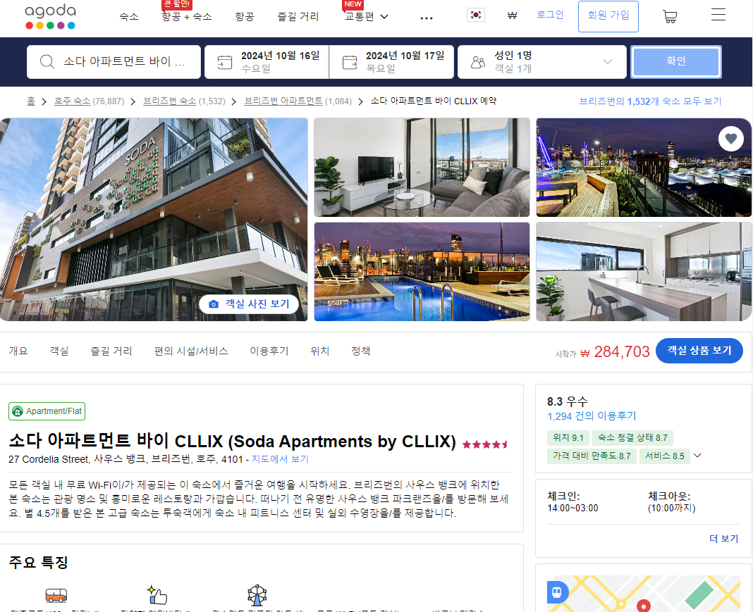 소다 아파트먼트 바이 CLLIX (Soda Apartments by CLLIX) 호텔은 브리즈번의 넓은 객실과 깨끗한 위생상태, 대중교통을 이용하기 편하며, 근처의 카페, 바, 레스토랑 등이 많아 편리한 지역, 위치좋은 호텔입니다. 사우스 뱅크 지구의 중심부에 위치해 있으며, 도시 전경도 좋고 시설도 좋습니다.
