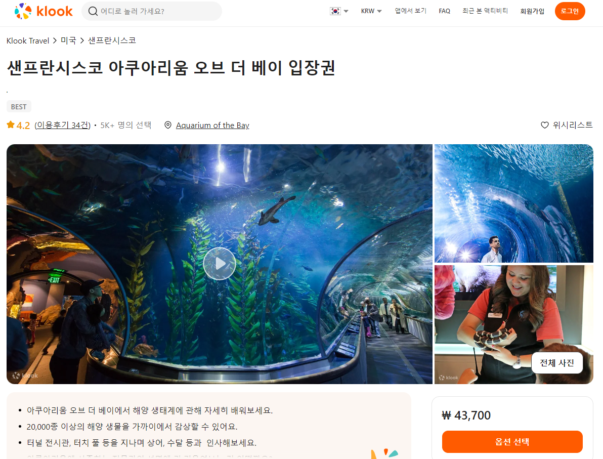 샌프란시스코 아쿠아리움 오브 더 베이 입장권은 클룩사이트에서 쉽게 예약하실 수 있으며, 이메일, 전화번호, 카카오톡, 네이버, 구글, 애플, 페이스복 등으로 간편하게 회원가입하고 이용하실 수 있습니다. 가격은 변동될 수 있으므로 예약시 다시 확인하고 이용하세요~