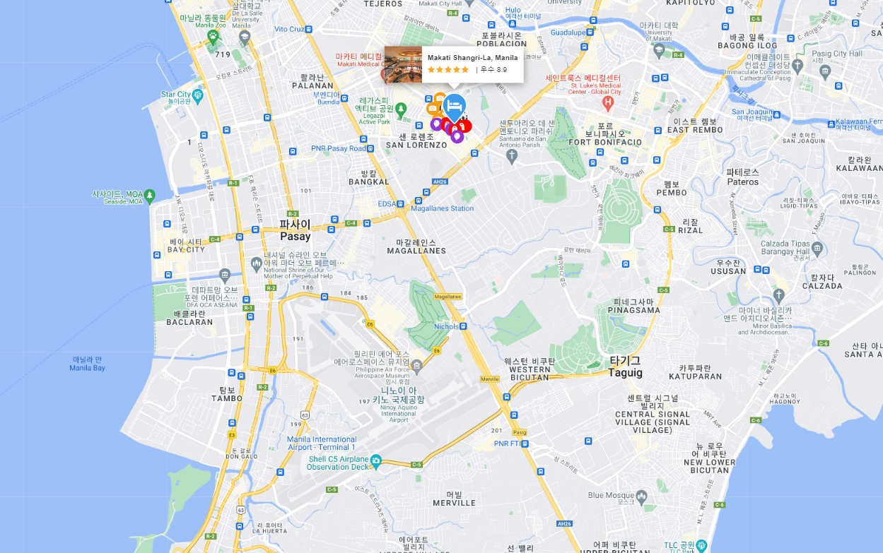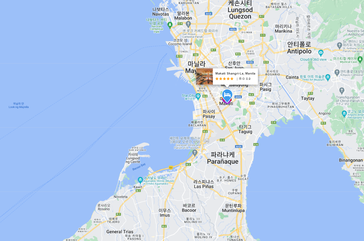 마닐라의 중심업무지구에 위치한 마카티 샹그릴라 마닐라 호텔(Makati Shangri-La Manila Hotel)은 쇼핑 및 유흥 중심지인 아얄라 센터 한가운데에 자리하고 있습니다. 마닐라 샹그릴라 호텔은 야외 수영장, 24시간 아로마테라피 및 마사지 서비스를 제공하며 마닐라의 가장 부촌이며, 번화가로 즐길거리, 쇼핑, 먹거리이 잘 되어 있으며, 가장 안전한 지역중에 한 곳입니다.