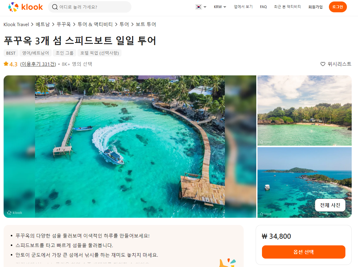 푸꾸옥 프라이빗 투어는 클룩사이트에서 쉽게 예약하실 수 있으며, 이메일, 전화번호, 카카오톡, 네이버, 구글, 애플, 페이스복 등으로 간편하게 회원가입하고 이용하실 수 있습니다. 가격은 변동될 수 있으므로 예약시 다시 확인하고 이용하세요
