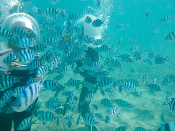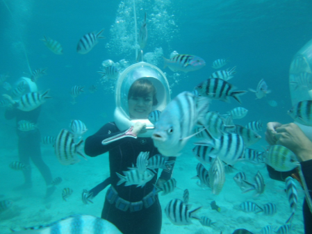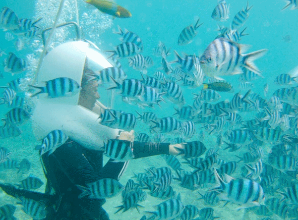 형형색색의 산호초와 다채로운 열대어가 가득한 바닷속 세상을 걸어보세요. 특수 제작된 다이빙 헬멧을 착용하면 편안하게 숨을 쉬며 깨끗한 바닷속을 거닐 수 있어요. 화장이 지워져 쌩얼이 드러날 걱정은 그만! 안경 착용까지 가능하답니다.