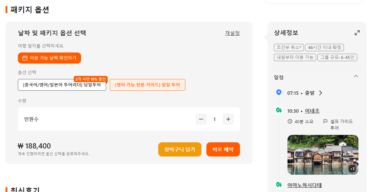 교토근교 해안 일일투어는 클룩사이트에서 쉽게 예약하실 수 있으며, 이메일, 전화번호, 카카오톡, 네이버, 구글, 애플, 페이스복 등으로 간편하게 회원가입하고 이용하실 수 있습니다. 가격은 변동될 수 있으므로 예약시 다시 확인하고 이용하세요~