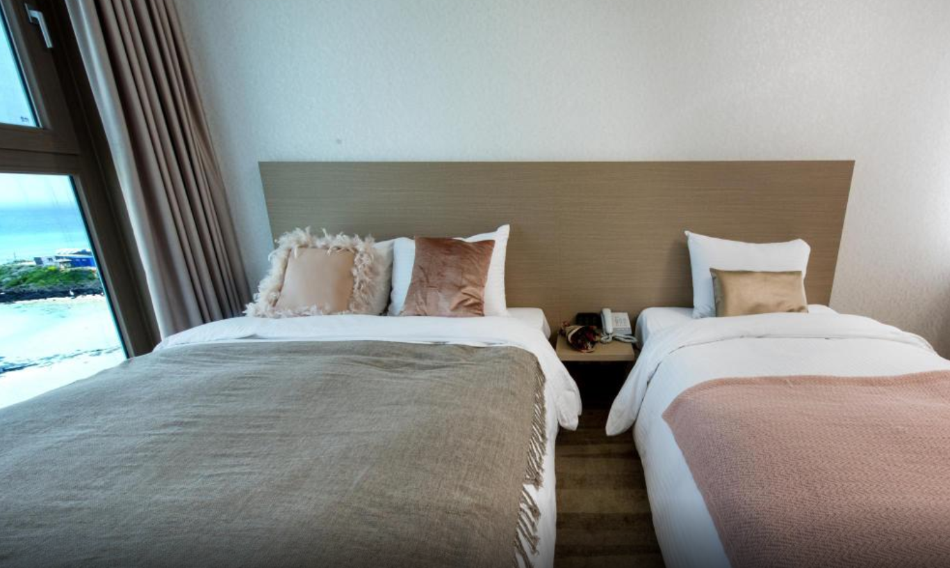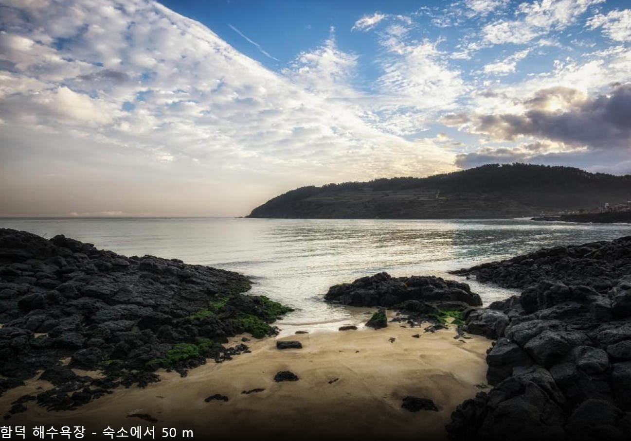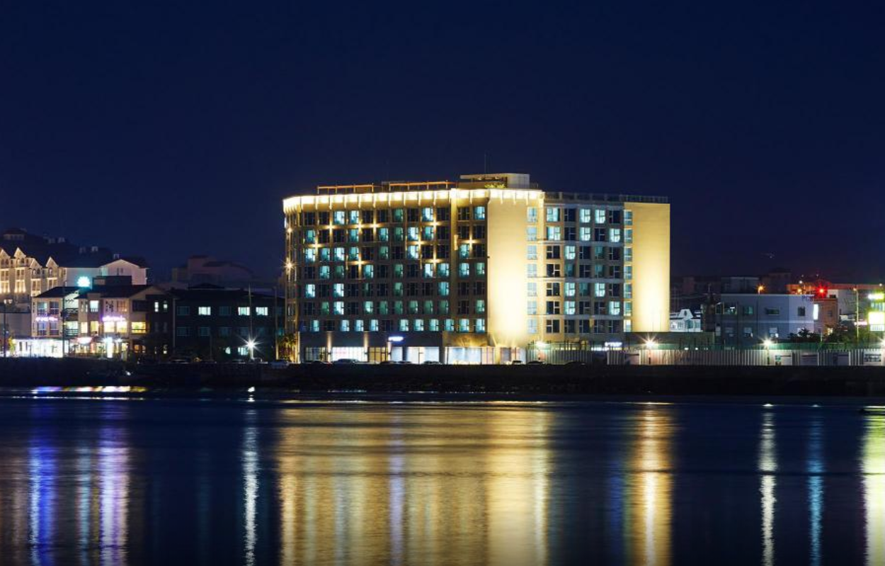 함덕해수욕장 바로 앞에 위치한 호텔이며, 디럭스 룸 이용하시면 바다에 물이 가득 차올랐을 때 마치 바다 위에 누워있는 듯한 기분을 감상하실 수 있습니다!! 숙소 내부시설 모두 청결하며, 조식도 매일 조금씩 바뀌어서 즐겁게 식사하실 수 있습니다. 다만 밤늦게 바다를 보러나온 사람들이 가끔 폭죽을 쏘아올릴 때가 있어 창문을 열어두면 다소 소음이 발생하니 그 점만 유의한다면 최고의 호텔이라고 할 만 합니다!