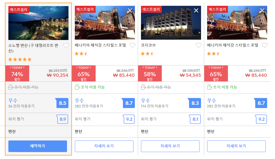 소노벨 변산 (구 대명리조트 변산) (SONO BELLE BYEONSAN (DAEMYUNG RESORT BYEONSAN))의 최저 가격대는 아고다에서 할인특가 가격으로 매일매일 변동되며 평균 10만원대부터 다양하게 형성됩니다. 아고다 최저가를 확인하시려면 아래 링크를 누르시면 원하는 날짜의 가격대를 자세히 보실 수 있습니다.