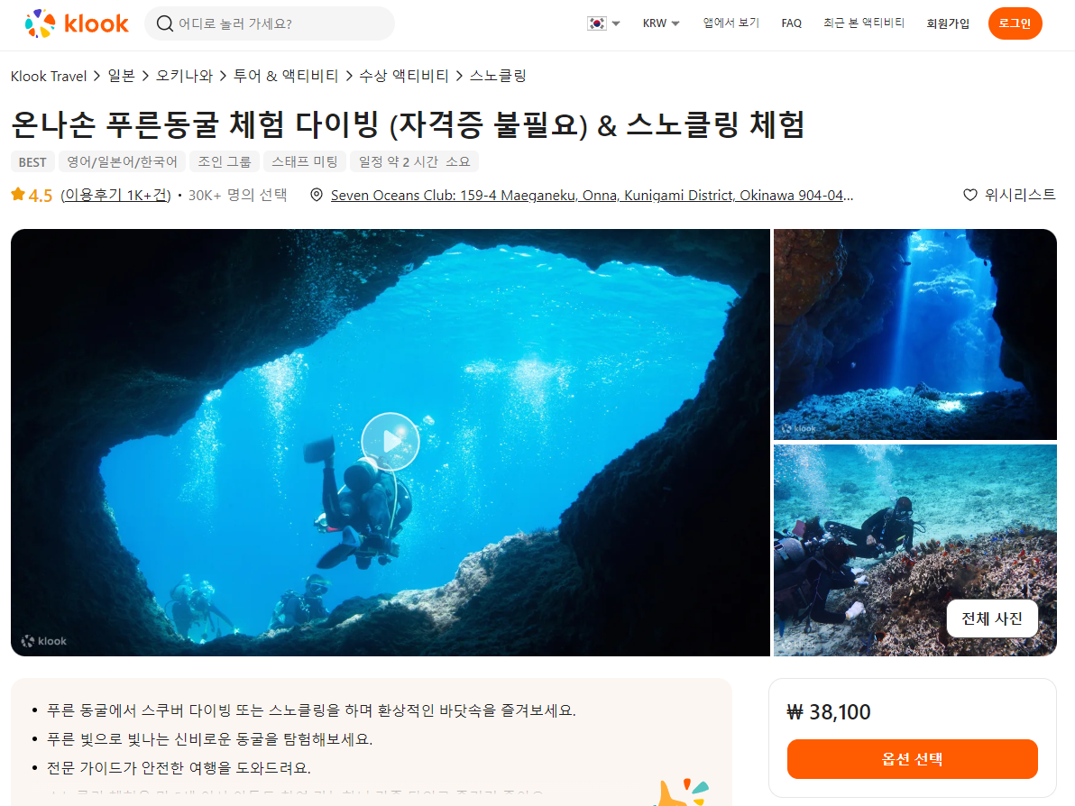 오키나와 온나손 푸른동굴 스쿠버 다이빙과 스노클링은 클룩사이트에서 쉽게 예약하실 수 있으며, 이메일, 전화번호, 카카오톡, 네이버, 구글, 애플, 페이스복 등으로 간편하게 회원가입하고 이용하실 수 있습니다. 가격은 변동될 수 있으므로 예약시 다시 확인하고 이용하세요~
