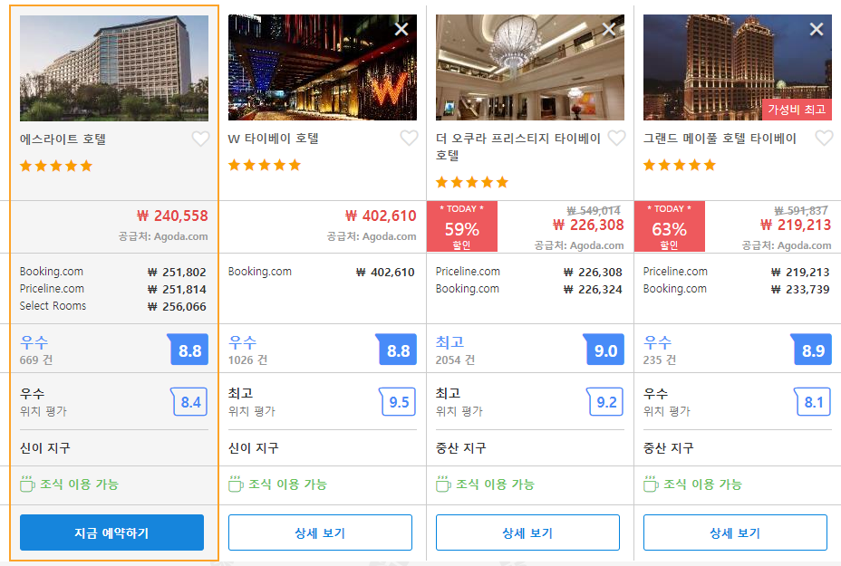 타이페이 에스라이트 호텔(eslite hotel)의 최저 가격대는 아고다에서 할인특가 가격으로 매일매일 변동되며 20만원대부터 다양하게 형성됩니다. 아고다 최저가를 확인하시려면 아래 링크를 누르시면 원하는 날짜의 가격대를 자세히 보실 수 있습니다.