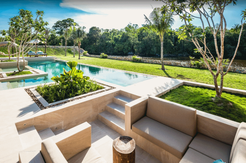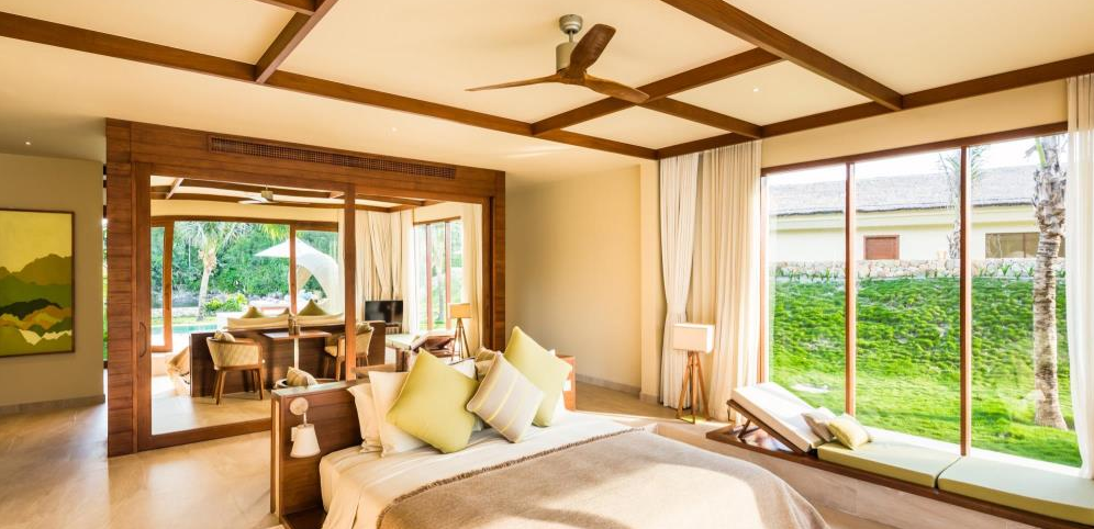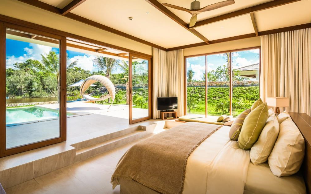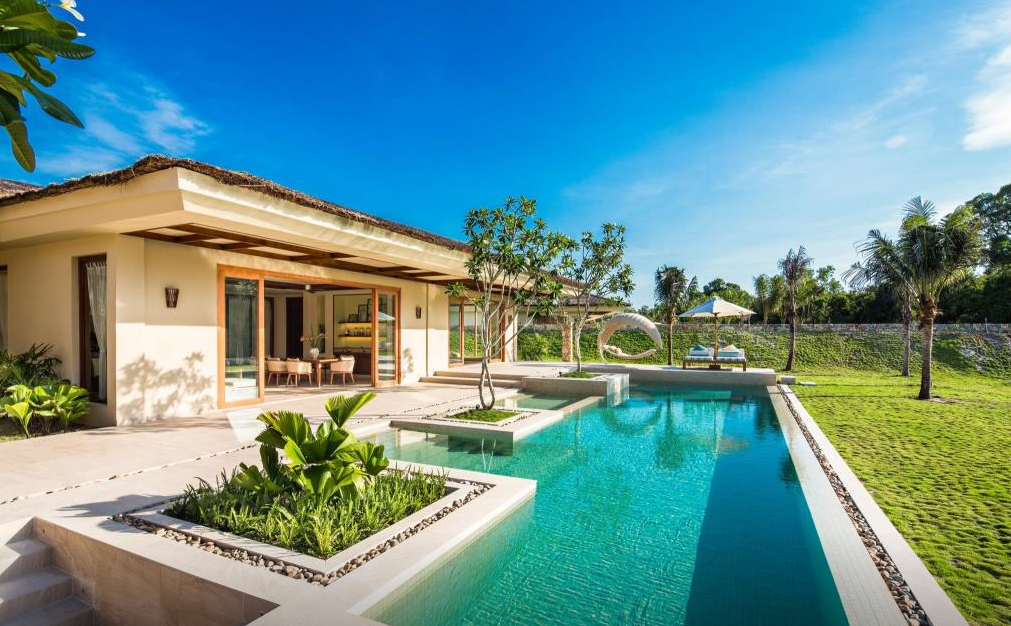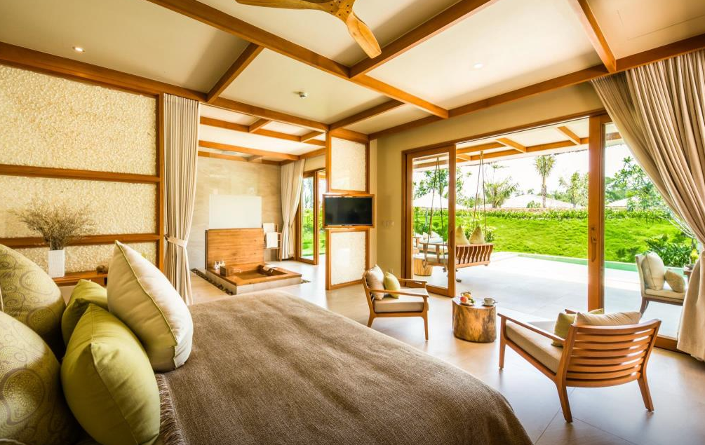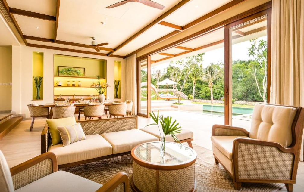 리조트는 넓은 부지에 세련된 디자인의 빌라들이 자리 잡고 있으며, 각 빌라는 개인 수영장과 정원이 딸려 있어 프라이빗한 휴식을 즐길 수 있습니다. 내부는 현대적인 인테리어와 고급스러운 가구로 꾸며져 있어 아늑하면서도 편안한 분위기를 제공합니다. 특히, 자연 채광을 최대한 활용한 대형 창문 덕분에 실내에서도 바다와 정원의 아름다운 풍경을 감상할 수 있습니다.