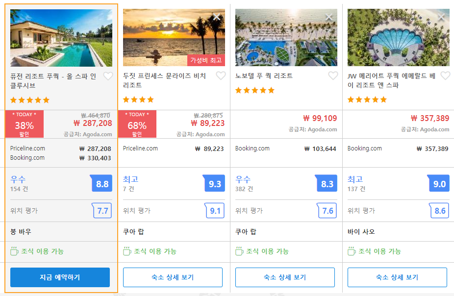 퓨전 리조트 푸쿽(Fusion Resort Phu Quoc)의 최저 가격대는 아고다에서 할인특가 가격으로 매일매일 변동되며 20만원대부터 다양하게 형성됩니다. 아고다 최저가를 확인하시려면 아래 링크를 누르시면 원하는 날짜의 가격대를 자세히 보실 수 있습니다.