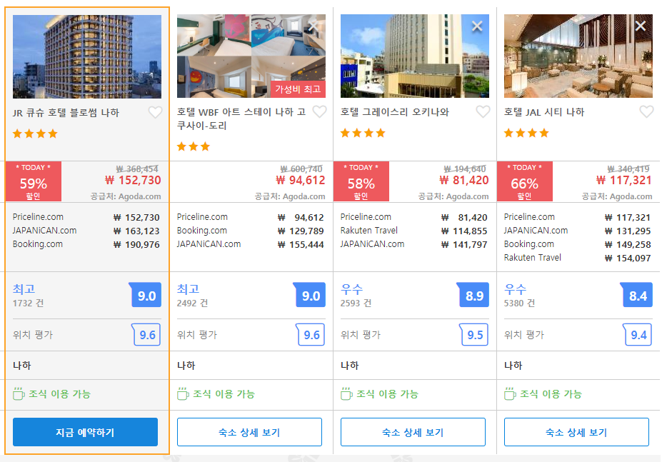 JR 큐슈 호텔 블로썸 나하 (JR Kyushu Hotel Blossom Naha)의 최저 가격대는 아고다에서 할인특가 가격으로 매일매일 변동되며 평균 10만원대부터 다양하게 형성됩니다. 아고다 최저가를 확인하시려면 아래 링크를 누르시면 원하는 날짜의 가격대를 자세히 보실 수 있습니다.