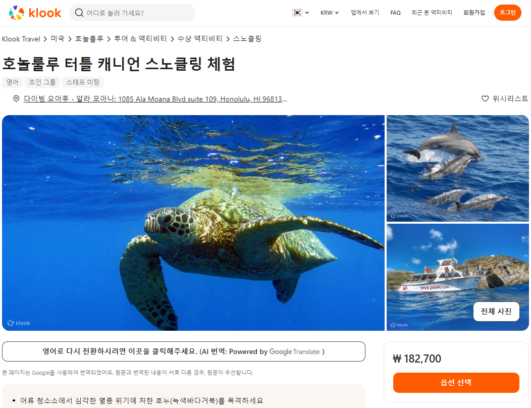 하와이 터틀캐년 스노클링은 클룩사이트에서 쉽게 예약하실 수 있으며, 이메일, 전화번호, 카카오톡, 네이버, 구글, 애플, 페이스복 등으로 간편하게 회원가입하고 이용하실 수 있습니다. 가격은 변동될 수 있으므로 예약시 다시 확인하고 이용하세요~