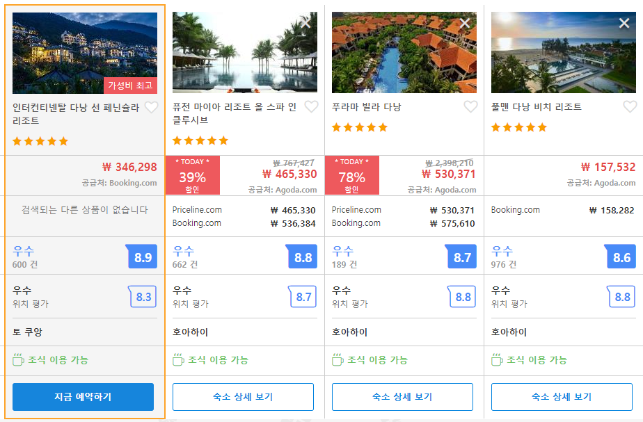 인터컨티넨탈 다낭 선 페닌슐라 리조트의 최저 가격대는 아고다에서 할인특가 가격으로 매일매일 변동되며 20만원대부터 다양하게 형성됩니다. 아고다 최저가를 확인하시려면 아래 링크를 누르시면 원하는 날짜의 가격대를 자세히 보실 수 있습니다.