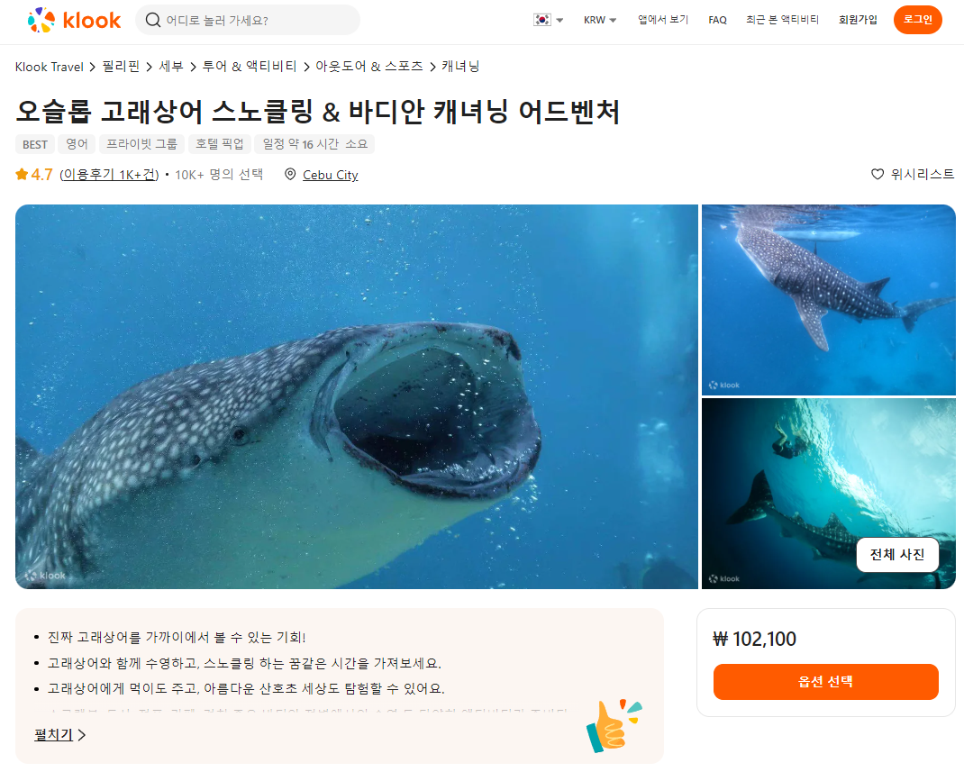 오슬롭 고래상어 스노클링과 바디안 캐녀닝 어드벤처 투어는 클룩사이트에서 쉽게 예약하실 수 있으며, 이메일, 전화번호, 카카오톡, 네이버, 구글, 애플, 페이스복 등으로 간편하게 회원가입하고 이용하실 수 있습니다. 가격은 변동될 수 있으므로 예약시 다시 확인하고 이용하세요~