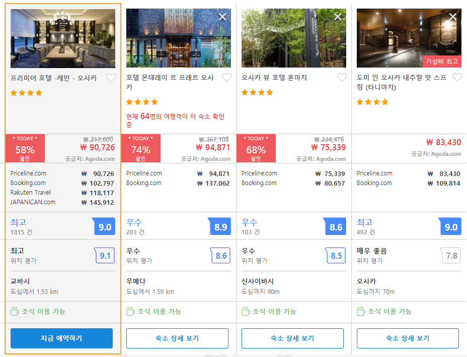 프리미어호텔 캐빈 오사카의 최저 가격대는 아고다에서 할인특가 가격으로 매일매일 변동되며 평균 10만원대부터 다양하게 형성됩니다. 아고다 최저가를 확인하시려면 아래 링크를 누르시면 원하는 날짜의 가격대를 자세히 보실 수 있습니다.