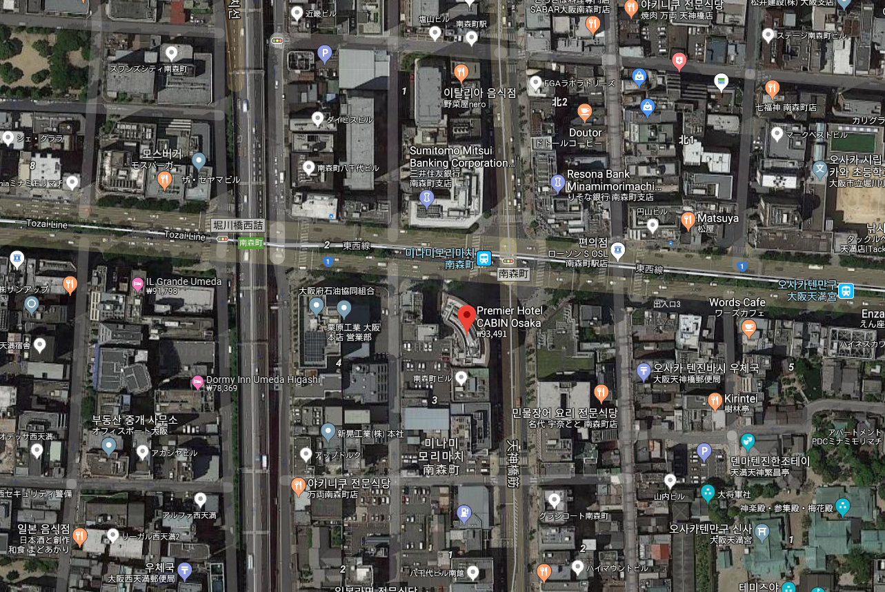 미나미모리마치역네 위치해 있는 프리미어 호텔 캐빈 오사카는 우메다까지 10분안쪽에 있는 곳이며, 교토나, 공항으로 이동시에도 좋은 위치입니다. 근처의 편의점, 24시간마트, 시장 등이 있어 여행자에게 무척 편리한 호텔입니다.