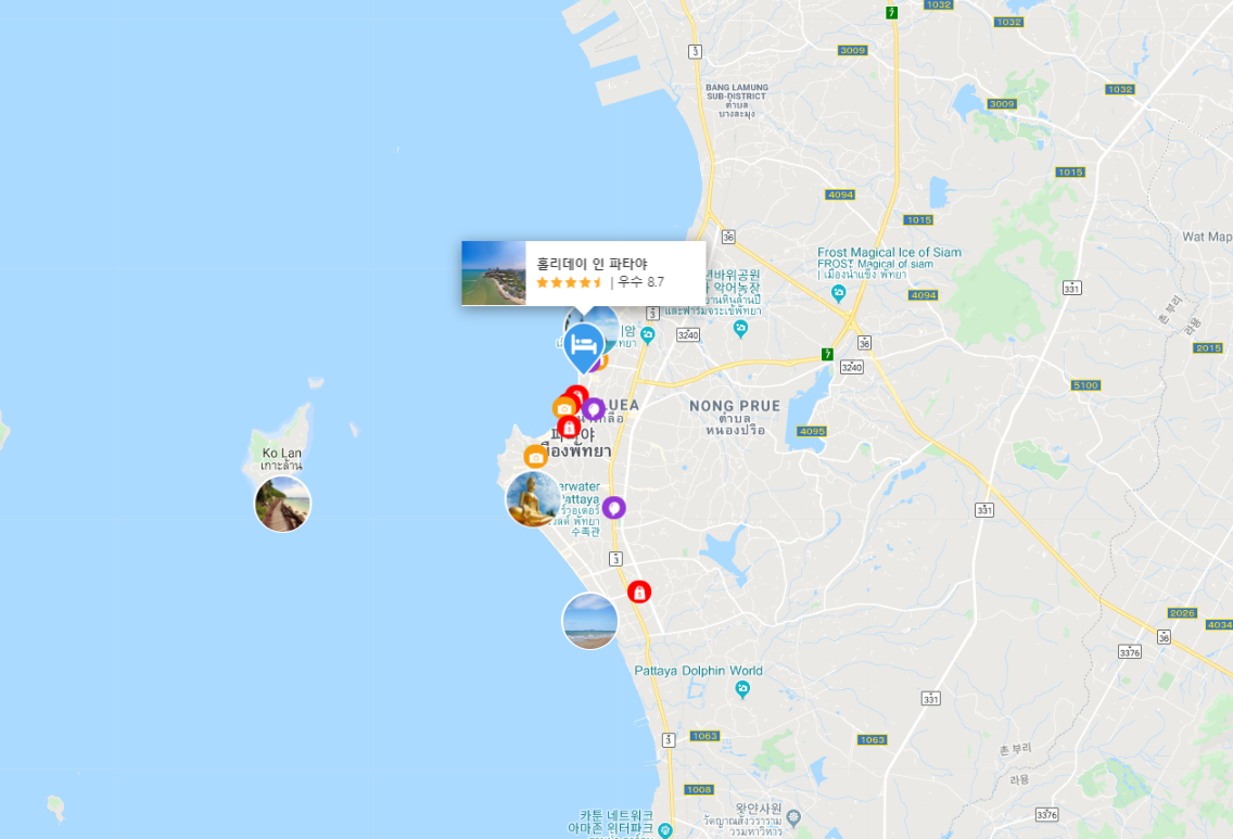 파타야 비치의 시작점 쪽에 위치한 홀리데이인 파타야호텔은 바로 앞에 비치가 있고, 썽태우로 10바트정도에 워킹 스트리트로 이동할 수 있습니다.