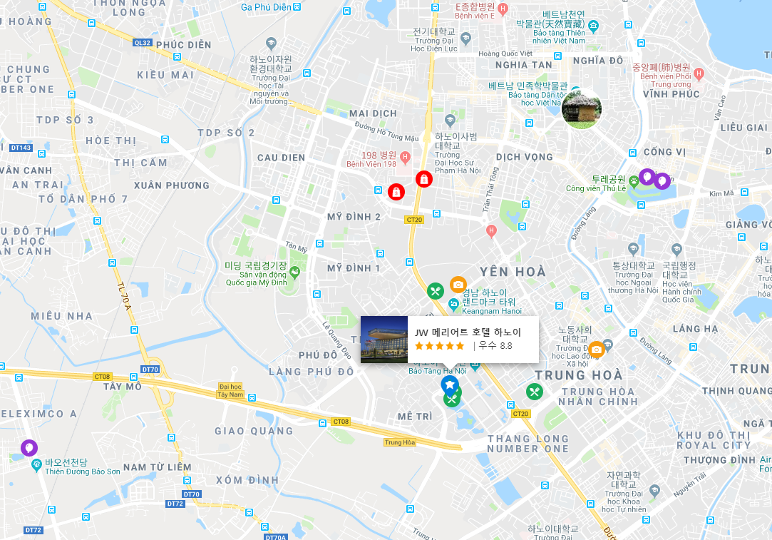 비즈니스 및 레저 여행 모두를 충족시킬 수 있는 JW 메리어트 호텔 하노이(JW Marriott Hotel Hanoi)는 도시에서 가장 유명한 지역 중 하나인 충 화 난 친에 있습니다. 도심에서 단 10 km, 공항에서는 26 km 거리에 있는 본 5성급 숙소에 매년 수많은 관광객들이 머물고 있습니다. 본 숙소는 Keangnam Hanoi Landmark Tower, 베트남 국립 컨벤션 센터, Benh Vien Y Hoc Co Truyen Bo Cong An 등과 같은 많은 관광지 및 명소와 가까운 거리에 있습니다.