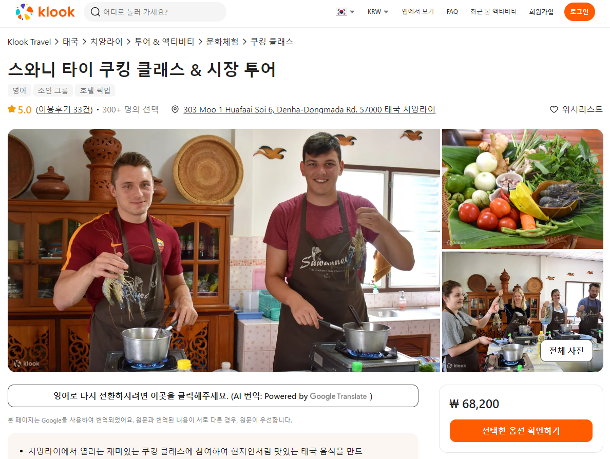 치앙라이 스와니 타이 쿠킹 클래스와 시장투어는 클룩사이트에서 쉽게 예약하실 수 있으며, 이메일, 전화번호, 카카오톡, 네이버, 구글, 애플, 페이스복 등으로 간편하게 회원가입하고 이용하실 수 있습니다. 가격은 변동될 수 있으므로 예약시 다시 확인하고 이용하세요~