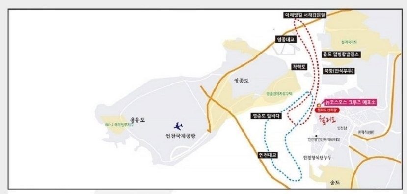 선착장 출발 > 영종도 > 작약도 > 연안대교앞바다 > 인천대교 >