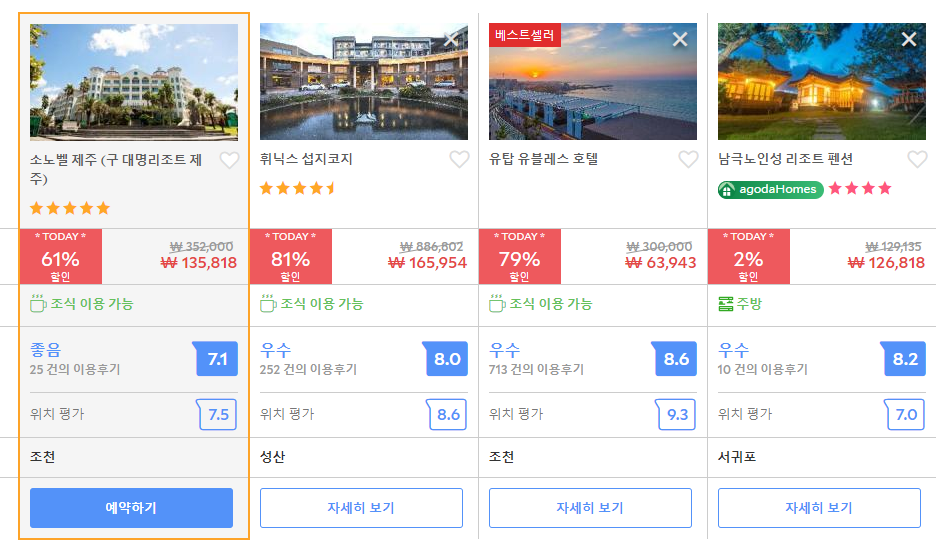 이번 제주 여행에서는 두곳의 이름있는 리조트를 선택하였습니다. 단연컨데 대명이 좋았습니다. 공항과의 접근성 동쪽관광지의 접근성 함덕해수욕장과의 접근성 그리고 직원들의 친근감은 그 어떤 곳에서도 느낄 수 없었던 최고였던것같습니다. 특히 식당직원의 어린 아이들을 위한 살가움, 어른에게도 다가가는 친금함은 최고라고 생각합니다. 그리고 리조트는 시설이 깔끔했습니다. 주기적인 시설 업그레이드는 참 좋다고 생각합니다.