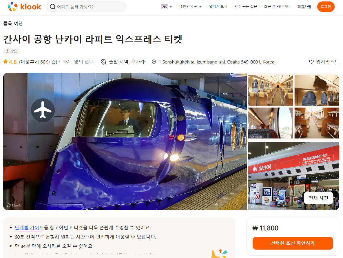 오사카 라피트 특급열차 티켓은 클룩사이트에서 쉽게 예약하실 수 있으며, 이메일, 전화번호, 카카오톡, 네이버, 구글, 애플, 페이스복 등으로 간편하게 회원가입하고 이용하실 수 있습니다. 가격은 변동될 수 있으므로 예약시 다시 확인하고 이용하세요~