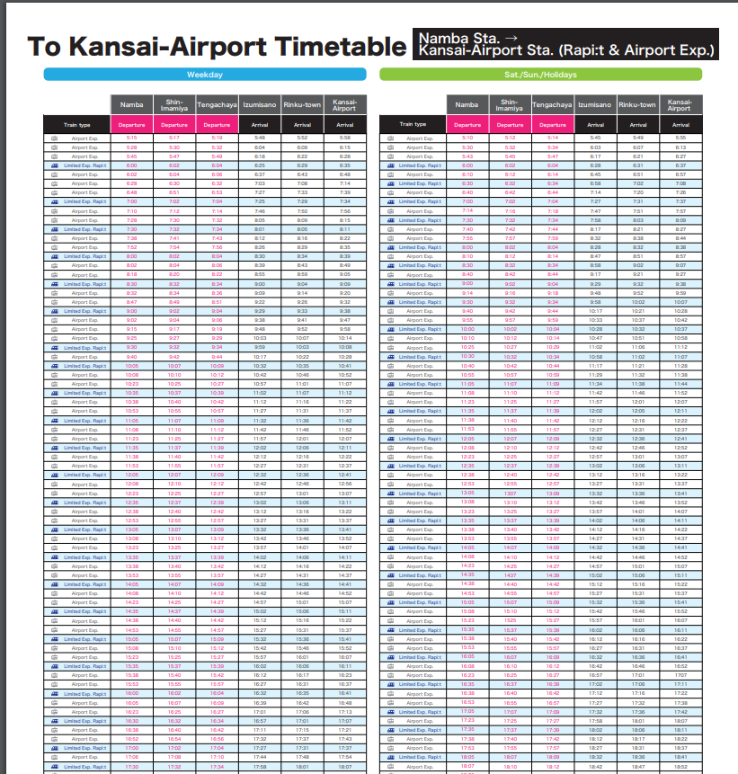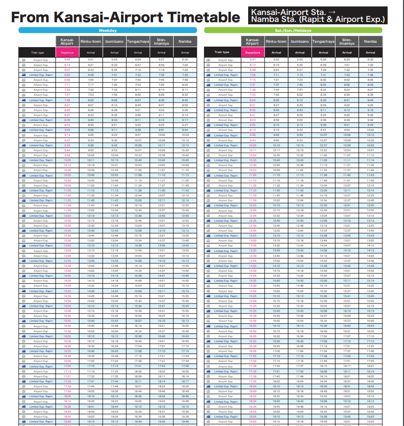 난바 역-간사이 공항 방면: 6:00am-10:00pm 사이 매 30분 간격으로 운행 / 시간표를 참고해주세요.