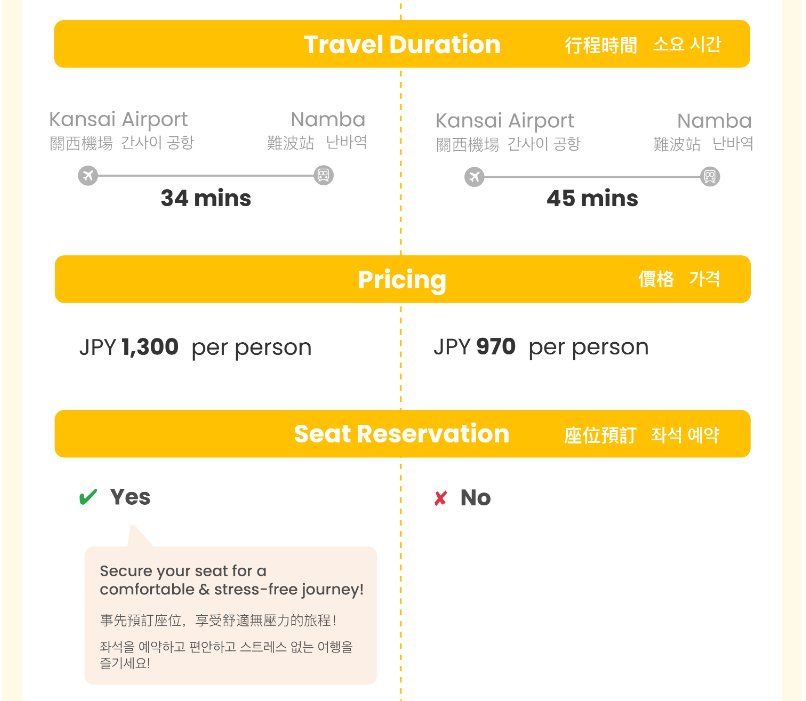 30분간격으로 운행하여 보다 쉽게 편한 시간대에 이용이 가능하며, 종착역인 난바역은 오사카 교통의 허브로, 다른 목적지로 이동하기에도 매우 편리하고, 중요한 역입니다.
