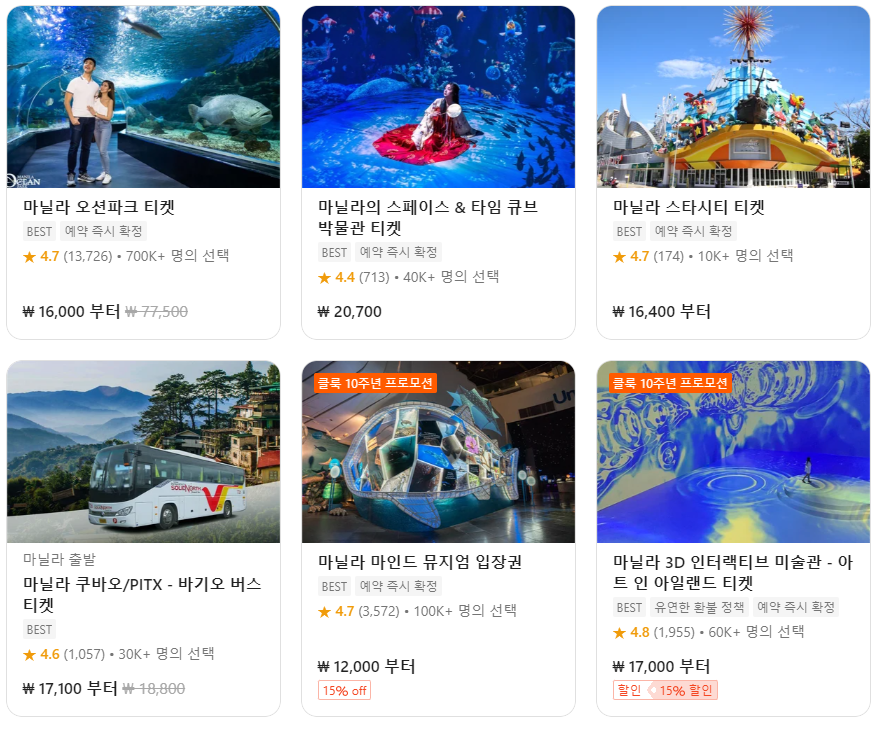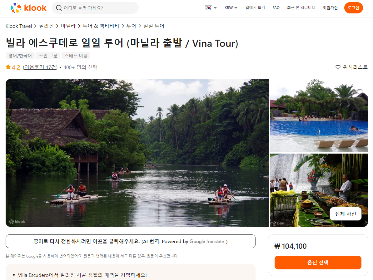 마닐라 빌라 에스쿠데로 일일투어는 클룩사이트에서 쉽게 예약하실 수 있으며, 이메일, 전화번호, 카카오톡, 네이버, 구글, 애플, 페이스복 등으로 간편하게 회원가입하고 이용하실 수 있습니다. 가격은 변동될 수 있으므로 예약시 다시 확인하고 이용하세요~