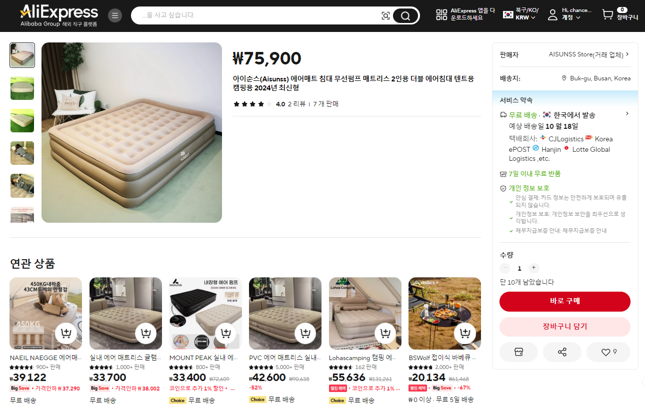 캠핑용으로 좋은 아이순스 더블 에어침대는 알리익스프레스 직구사이트에서 저렴하게 구매하실 수 있습니다. 이 제품의 경우 한국에서 배송하는 만큼 빨리 받으실 수 있습니다. 알리익스프레스 사이트는 중국 대형 전자상거래 플랫폼 1위 알리바바 그룹이 운영하는 온라인 쇼핑몰로 저렴한 가격으로 다양한 상품을 구매할 수 있다는 점이 큰 매력입니다. 폭넓은 카테고리에서 전자제품, 의류, 액세서리 등을 제공하며, 전 세계로 배송이 가능하고 무료 배송 옵션도 있습니다. 안전한 결제를 위한 에스크로 시스템이 마련되어 있어 거래가 안전합니다. 또한, 다른 소비자들의 리뷰와 평가를 통해 품질을 확인할 수 있으며, 한국에서는 중국도매사이트로 유명하며 많은 제품들을 구매하여 한국내에서 소매로 판매하고 있으며 최근에서 한국에서 많이 입점하여 한국에서 발송하는 제품들도 있습니다.
