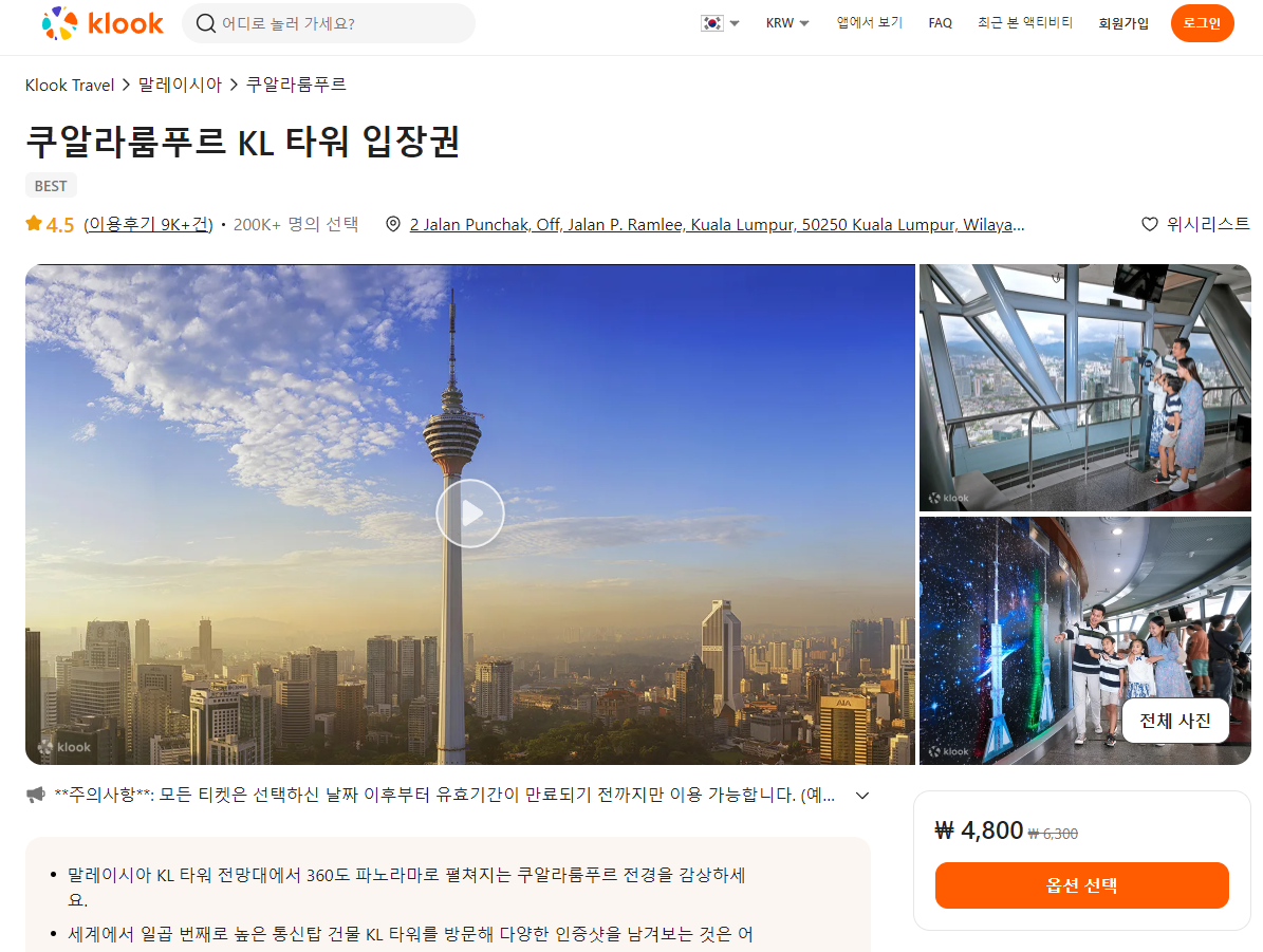 쿠알라룸푸르 KL타워 전망대 입장권은 클룩사이트에서 쉽게 예약하실 수 있으며, 이메일, 전화번호, 카카오톡, 네이버, 구글, 애플, 페이스복 등으로 간편하게 회원가입하고 이용하실 수 있습니다. 가격은 변동될 수 있으므로 예약시 다시 확인하고 이용하세요~