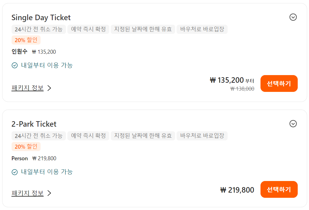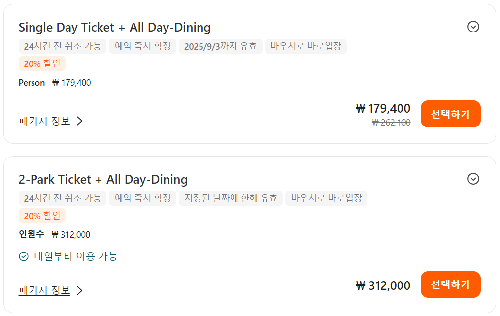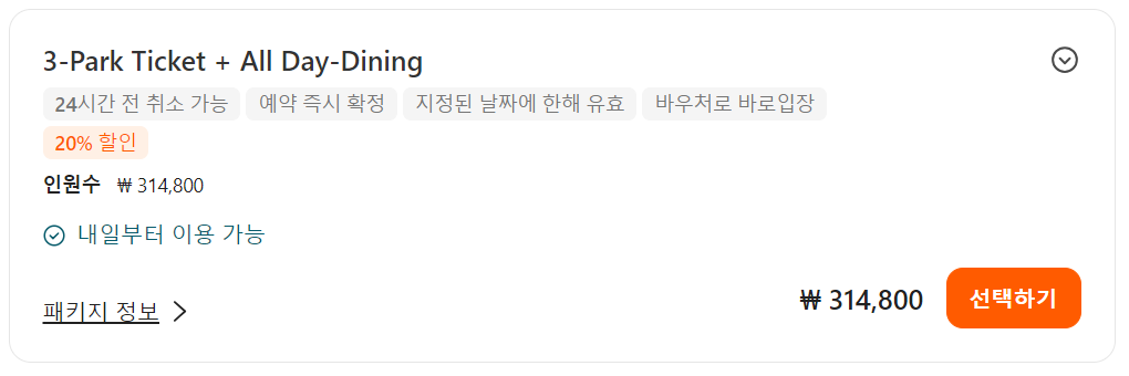 씨월드 올랜도 테마파크 입장권과 올데이 다이닝까지 포함 된 패키지 티켓은 168,700원이며, 온라인으로 미리 예약시 할인된 금액인 134,400원에 이용할 수 있습니다.