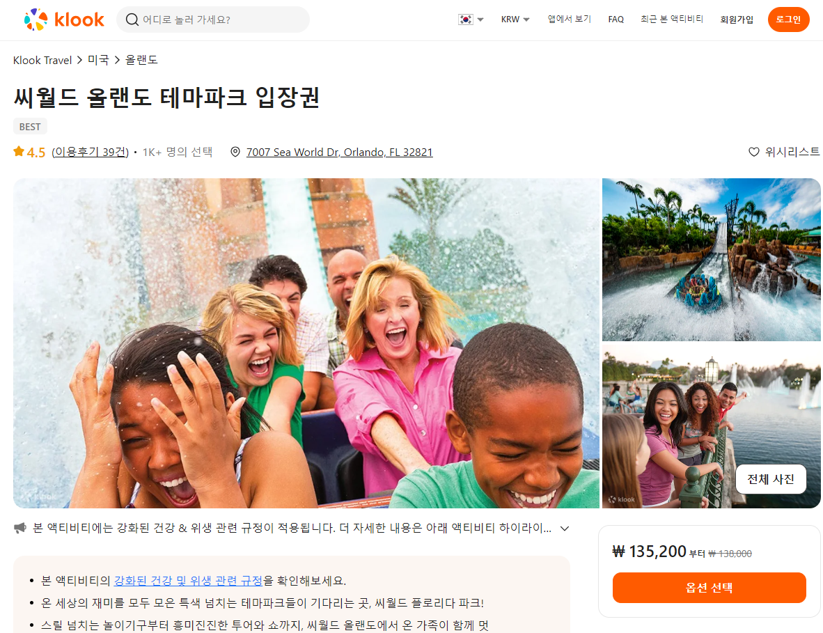 씨월드 올랜도 테마파크 입장권 및 다양한 옵션이 추가 된 패키지 티켓은 클룩사이트에서 쉽게 예약하실 수 있으며, 이메일, 전화번호, 카카오톡, 네이버, 구글, 애플, 페이스복 등으로 간편하게 회원가입하고 이용하실 수 있습니다. 가격은 변동될 수 있으므로 예약시 다시 확인하고 이용하세요~