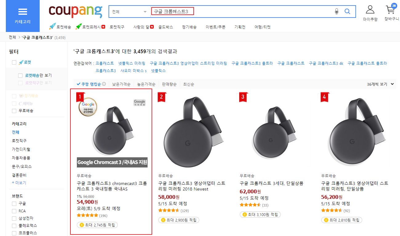 쿠팡사이트에서 구글 크롬캐스트3를 검색하시면,
