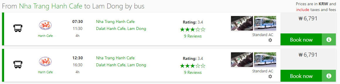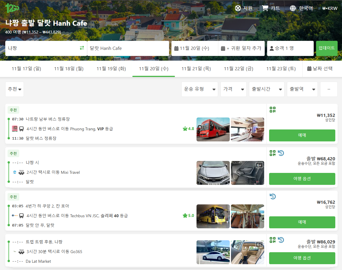 나트랑에서 달랏가는 교통편 노선정보 및 예약은 12go사이트에서 예약하실 수 있으며, 이 노선 뿐만아니라 나라전역의 노선, 나라간 노선의 검색가능한 모든 교통편을 검색하고 예약하실 수 있습니다. 한국어로 검색해보시고 나오지 않으면 영어로 검색하시면 보다 쉽게 노선을 확인하실 수 있습니다.