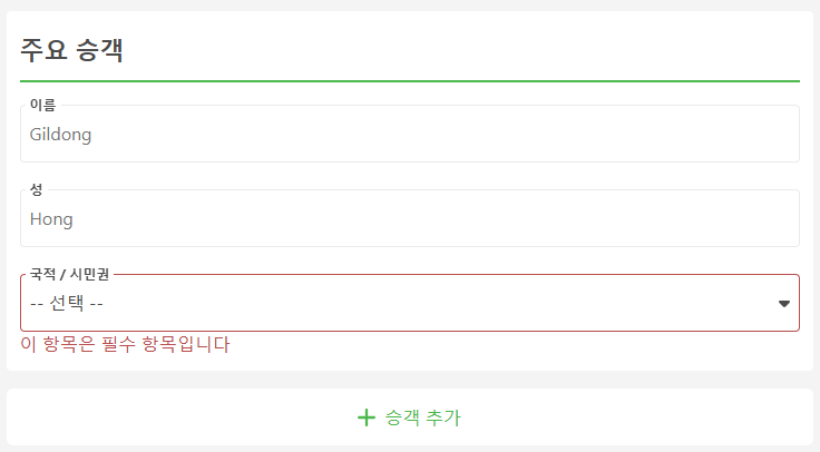 나트랑에서 달랏가는 교통편 예약시에는 휴대폰번호(한국번호도 가능), 이메일, 이름, 성, 국적을 입력하고 여행자보험은 선택사항입니다.