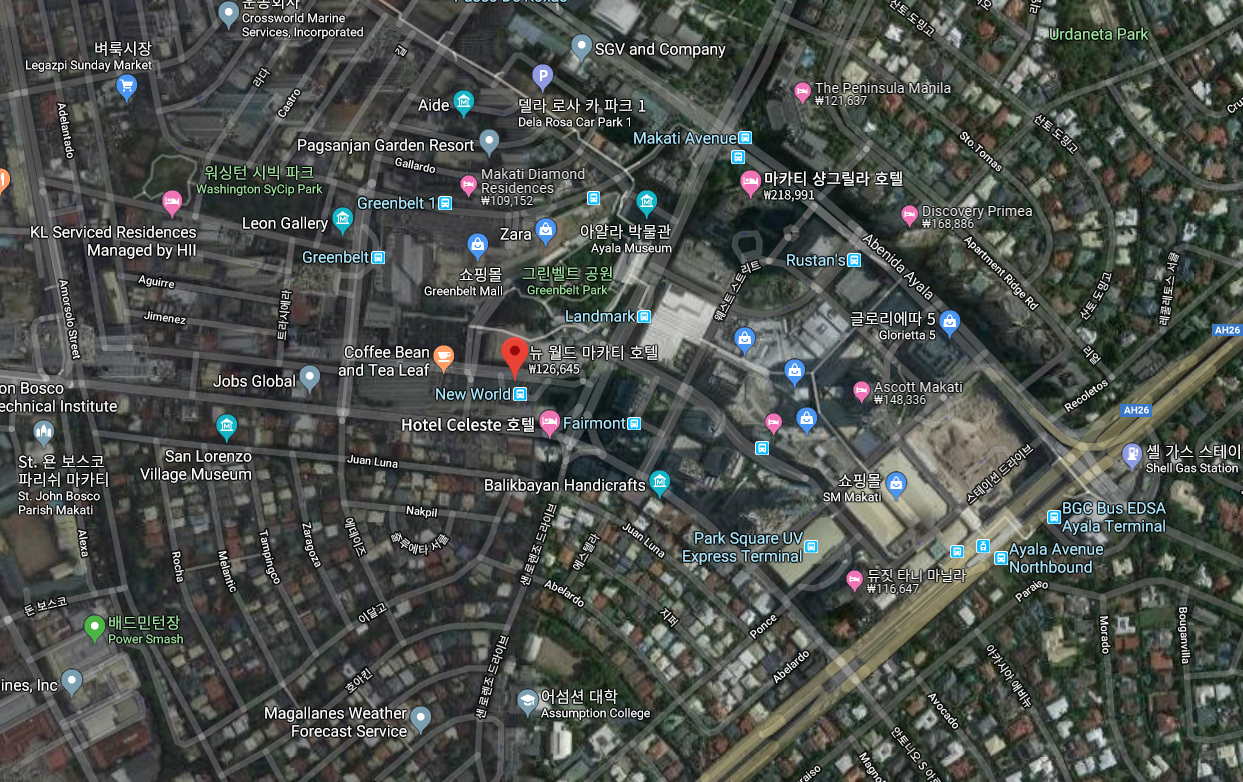 마닐라를 여행하며 부유층이 많이 사는 그린 벨트 근처 지역이라 마닐라에서 가장 안전한 지역인 마카티지역의 뉴월드마카티호텔(New World Makati Hotel)은 그린벨트에 가까워서 쇼핑이나 식사하러 나가기도 편하고 마닐라 최고 글럽들이 모여있는 보니파시오에서도 가까운 곳입니다.